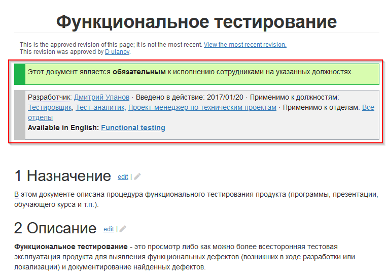Они регламентируют работу компании: политики, стратегии, описания процессов, методологические и рабочие инструкции. Поскольку они должны находиться под управлением, то для них предусмотрено утверждение (через расширение ApprovedRevs). По умолчанию отображается утверждённая версия, но вообще можно посмотреть любую версию документа, в т.ч. пока ещё не утверждённый черновик новой версии. А также сравнить любую версию с любой (базовая фича Mediawiki). Эти документы пишут их владельцы, утверждение происходит через менеджера по качеству.
