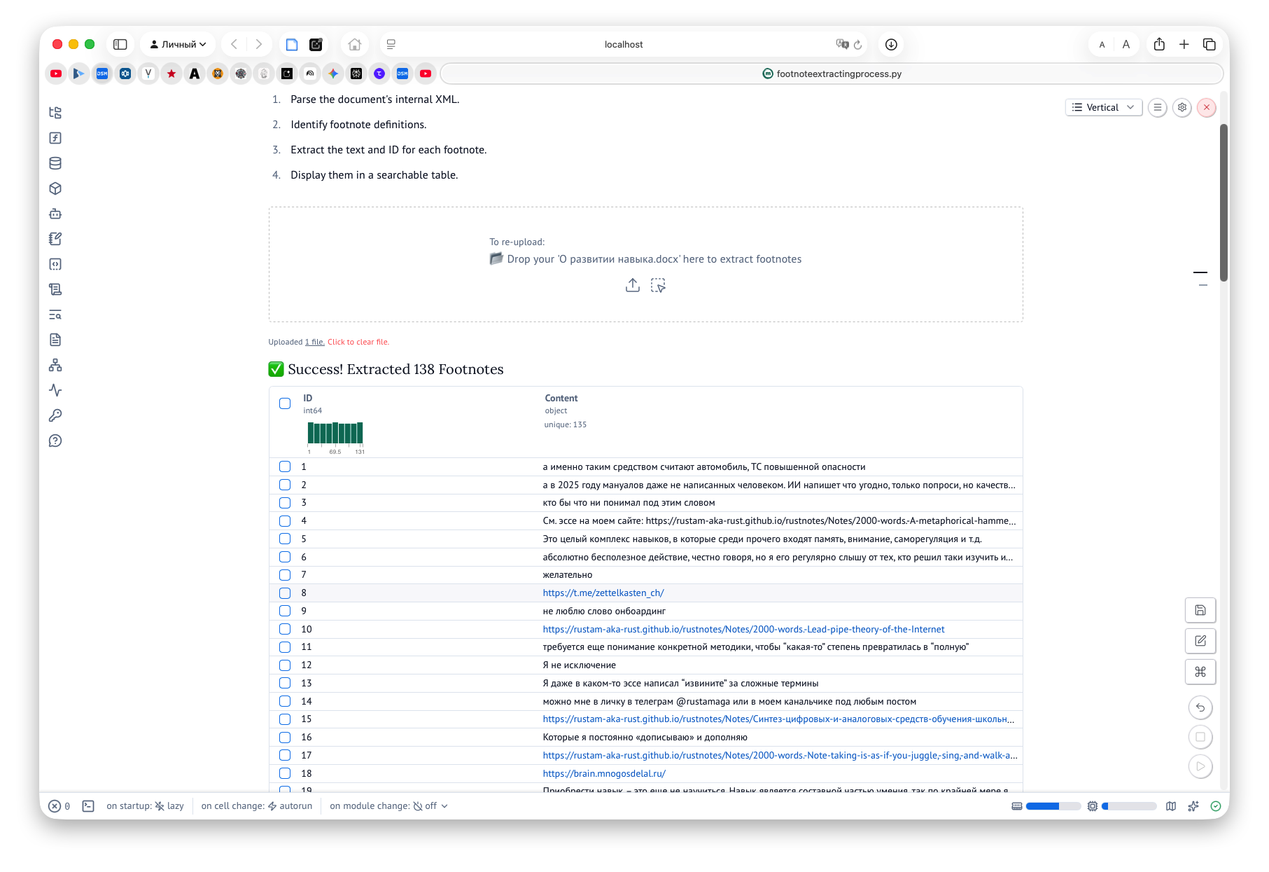Я быстро навайбкодил себе «приложение», которое извлекает все сноски из моего вордовского файла. Мне потребовалось чуть более 10 минут, чтобы сделать это. Но самое главное, Маримо выводит всё в виде списка, который можно фильтровать, и искать среди сносок нужную мне информацию. Например, все сноски, где есть http, или все, в которых встречается слово «эссе».