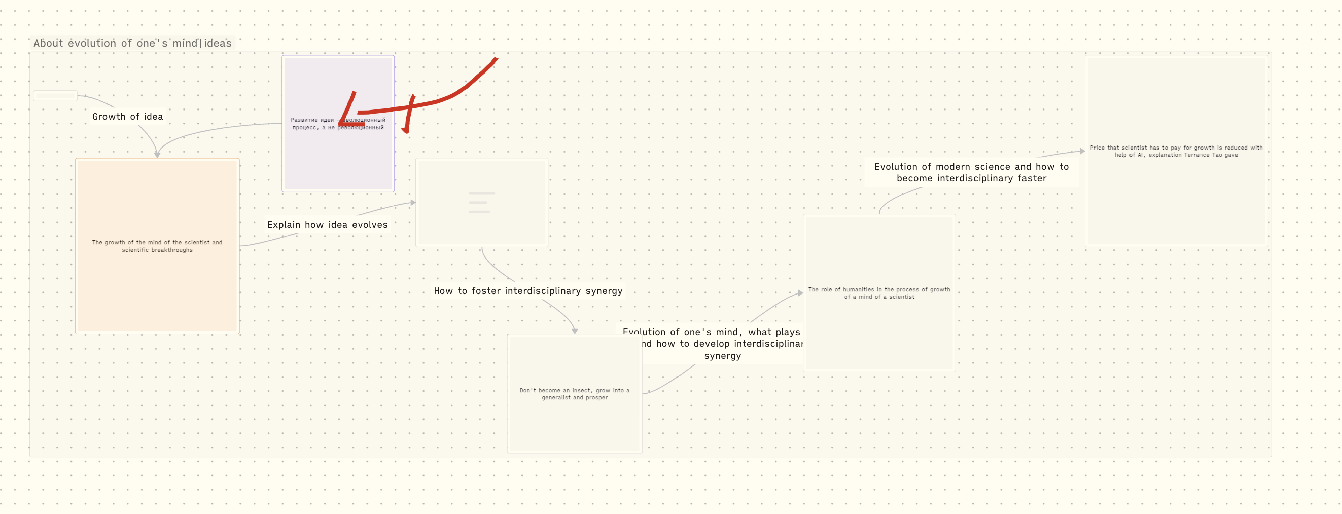 Эволюция идеи, а эволюционировать она может во что угодно, до какой-то практики или изолированной техники, является процессом аккумуляции собственных мыслей, культивации собственного знания, небольших местечковых инсайтов и открытий, которые в совокупности дают необходимый материал для одного “прорывного решения”.